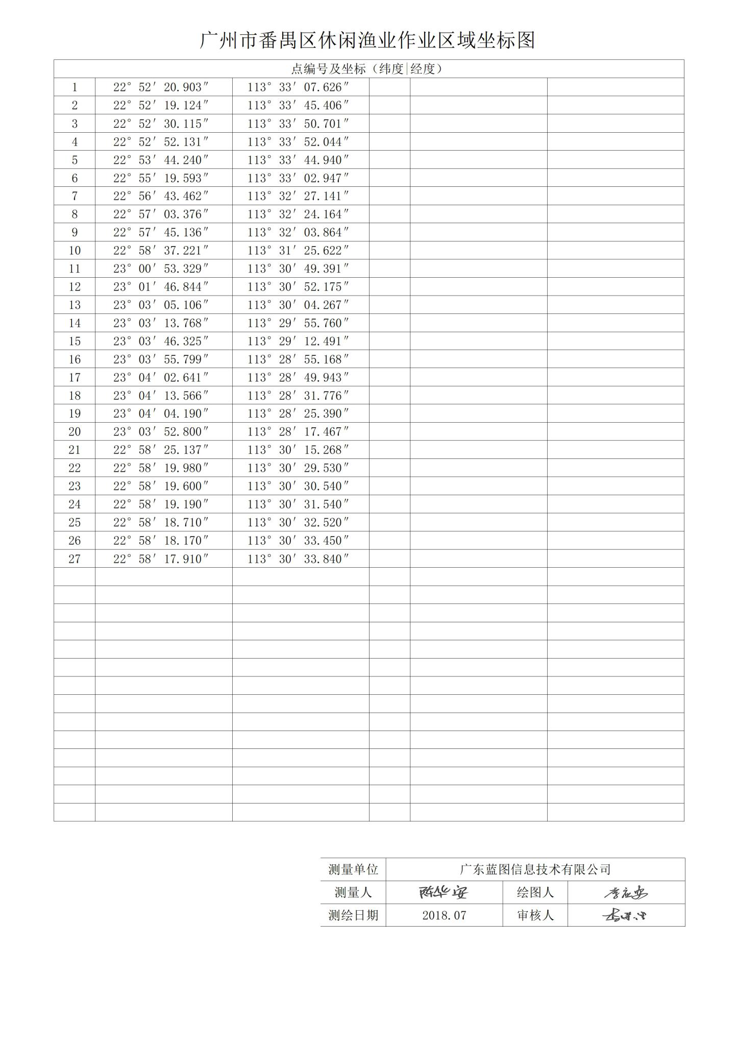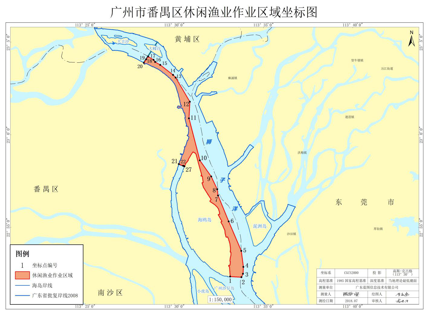 番禺区休闲渔业区为:坐标点1至坐标点20联线,坐标点20沿狮子洋西侧海岸线延伸至坐标点21,坐标点21至坐标点27联线,坐标点27沿海鸥岛西北侧和东侧海岸线延伸至坐标点1形成的闭环水域(海事部门公布的航道、锚地除外)。