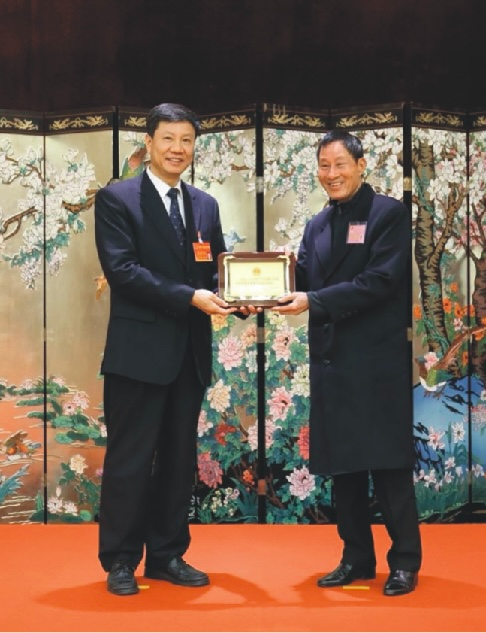 2018年时任广州市人大常委会主任陈建华(左)向区本先生颁发人大会议证书