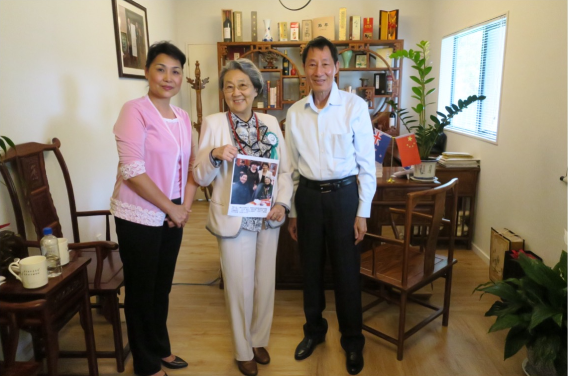 2016年周恩来总理侄女周秉德(中)手提当年与画家区本夫妇的合影在新西兰举办的周总理图片展中合照