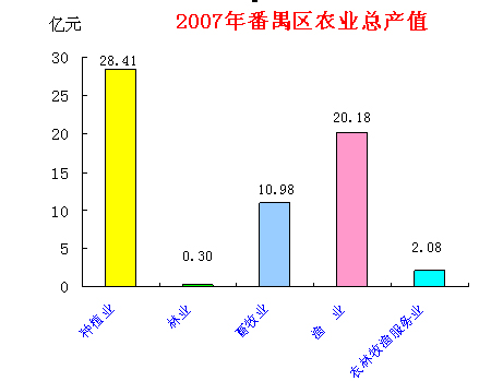农业生产在结构调整中平稳发展。通过大力推进农业产业化、机械化、标准化和科技化,传统型农业逐步向现代都市型农业转变。2007年,番禺区农业总产值61.95亿元,增长6.8%。其中,种植业产值28.41亿元,增长5.7%;畜牧业产值10.98亿元,增长0.6%;渔业产值20.18亿元,增长10.5%。