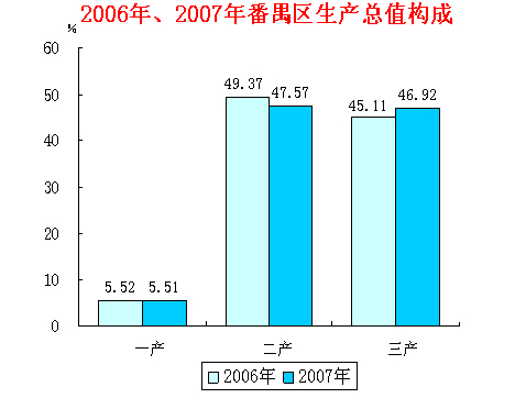 国民经济保持较快增长。据初步统计,2007年番禺区生产总值628.06亿元,增长13.0%。其中,第一产业增加值34.64亿元,增长6.8%;第二产业增加值298.74亿元,增长10.8%;第三产业增加值294.67亿元,增长16.2%。在第二产业中,工业增加值264.40亿元,增长11.8%。三次产业比重由上年5.52:49.37:45.11整为5.51:47.57:46.92。按户籍人口计算,人均生产总值为65330元,合8686美元(按1美元折7.5215人民币元汇率计算),按常住人口计算,人均生产总值为42554元,合5658美元(按1美元折7.5215人民币元汇率计算)