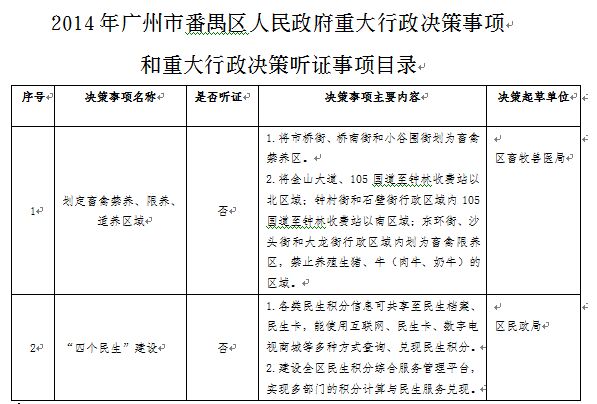 《2014年广州市番禺区人民政府重大行政决策事项和重大行政决策听证事项目录》业经区政府常务会议审议通过,现印发给你们,请按照《广州市重大行政决策程序规定》及《广州市番禺区实施〈广州市重大行政决策程序规定〉办法的通知》的有关规定认真贯彻执行。
