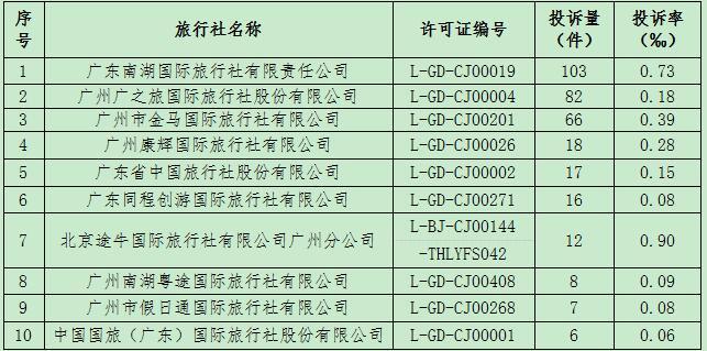 截止2017年6月30日,广州市共有旅行社563家,第二季度广州市组团人数共计256.43万人次。投诉热点主要集中在降低等级标准、导游服务问题、拒签退团扣费纠纷、旅行社因故延误变更行程等方面。按照《旅游法》、《旅行社条例》、《旅行社公告暂行规定》、广州市旅游局《旅游投诉信息公示内容及标准(试行)》的要求,现将以下投诉较多的旅行社公示如下: