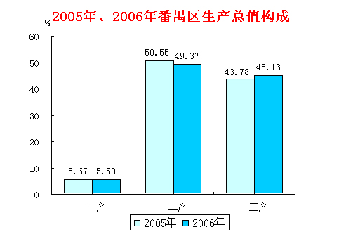 国民经济保持快速增长。据初步统计,2006年番禺区生产总值546.94亿元,增长12.5%。其中,第一产业增加值30.06亿元,增长6.2%;第二产业增加值270.03亿元,增长10.1%;第三产业增加值246.85亿元,增长16.2%。在第二产业中,工业增加值238.17亿元,增长13.9%。三次产业比重由上年的5.67:50.55:43.78调整为5.50:49.37:45.13。人均生产总值为58235元(按平均户籍人口计算),合7304美元(按1美元折7.9735元人民币汇率计算)。