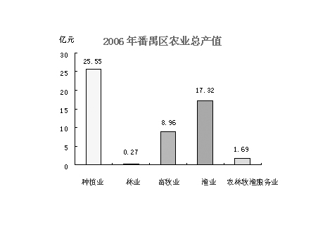 农业生产在结构调整中平稳发展。通过大力推进农业产业化、机械化、标准化和现代化,传统型农业逐步向现代都市型农业转变。2006年,番禺区农业总产值53.78亿元,增长6.2%。其中,种植业产值25.55亿元,增长3.7%;畜牧业产值8.96亿元,下降0.8%;渔业产值17.32亿元,增长 11.3%。